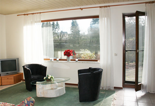 Über einen separaten Eingang ist die Ferienwohnung, 60 m², NR, im Souterrain eines Hauses am Südhang, erreichbar. Sie eignet sich für 1 - 4 Personen. Ein PKW-Stellplatz ist vorhanden. Das Badezimmer verfügt über eine Dusche und WC, ein Fenster, gegen ein geringes Entgeld ist die dort stehende Waschmaschine benutzbar. In der großen Küche befindet sich eine Spülmaschine, das große, sonnendurchflutete Wohnzimmer ist mit einem SAT-TV und Internet-Anschluss ausgestattet. Auf der großen Terrasse kann man an warmen Tage unter der Markise auf den schönen Gartenmöbeln sitzen.